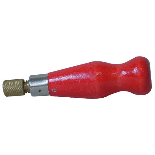 With a red handle and a threaded locking nut.
